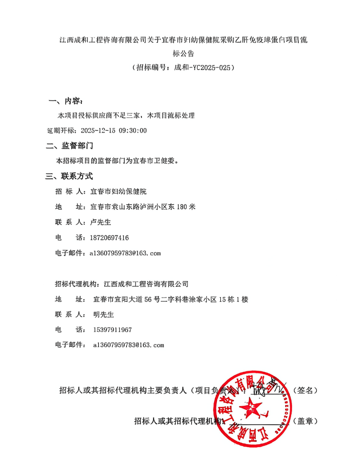 【宜春市妇幼保健院】江西成和工程咨询有限公司关于宜春市妇幼保健院采购乙肝免疫球蛋白项目流标公告