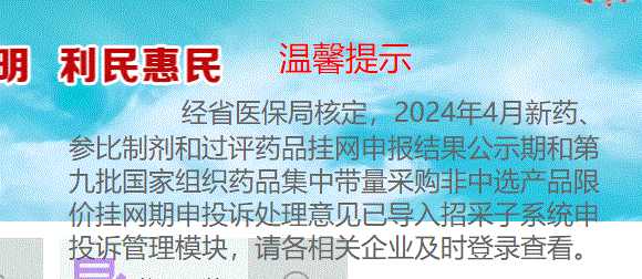 经省医保局核定,2024年4月新药、参比制剂和过评药品挂网申报结果公示期和第九批国家组织药品集中带量采购非中选产品限价挂网期申投诉处理意见已导入招采子系统申投诉管理模块,请各相关企业及时登录查看。