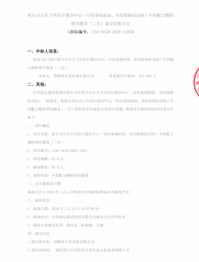 【黄石市公共卫生医疗救治中心】湖北省黄石市公共卫生医疗救治中心(市传染病医院、市结核病防治院)中药配方颗粒供应服务(二次)成交结果公告