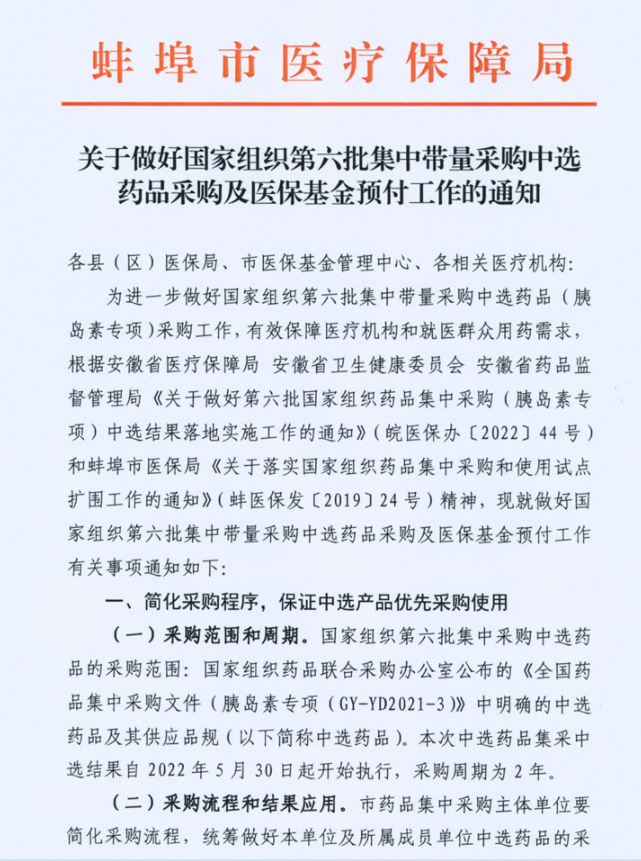 【蚌埠】关于做好第六批国采药品采购(胰岛素专项)和医保基金预付的通知