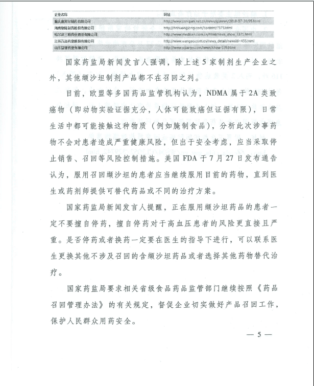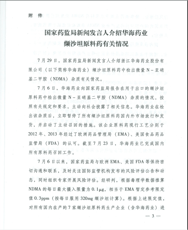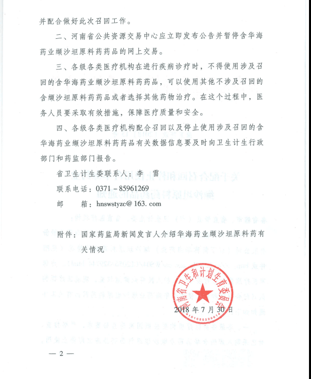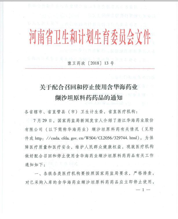 【河南】河南省关于配合召回和停止使用含华海药业缬沙坦原料药药品的通知