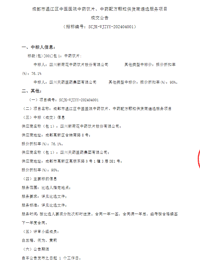 【成都市温江区中医医院】四川省成都市温江区中医医院中药饮片、中药配方颗粒供货商遴选服务项目成交公告