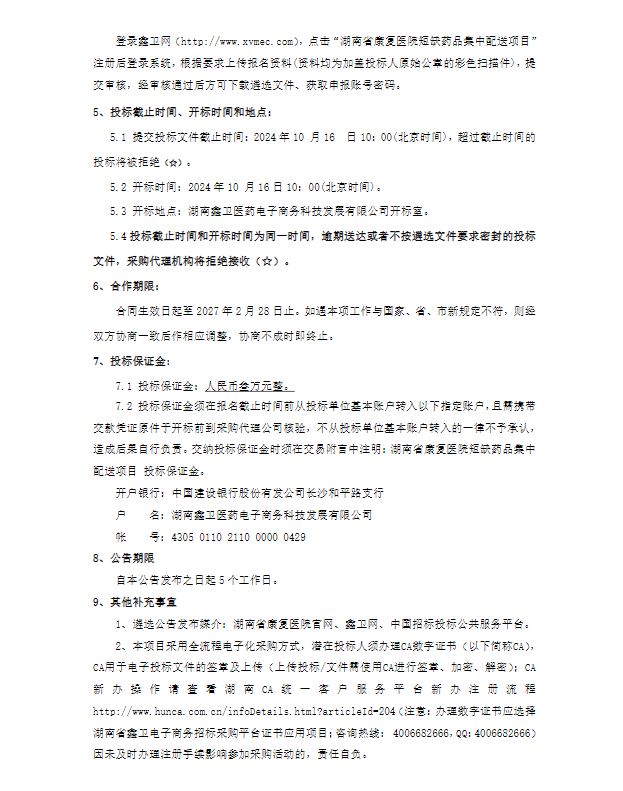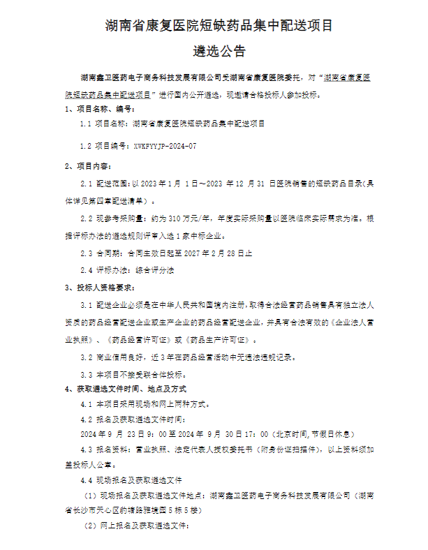 【湖南省康复医院】湖南省康复医院短缺药品集中配送项目遴选公告