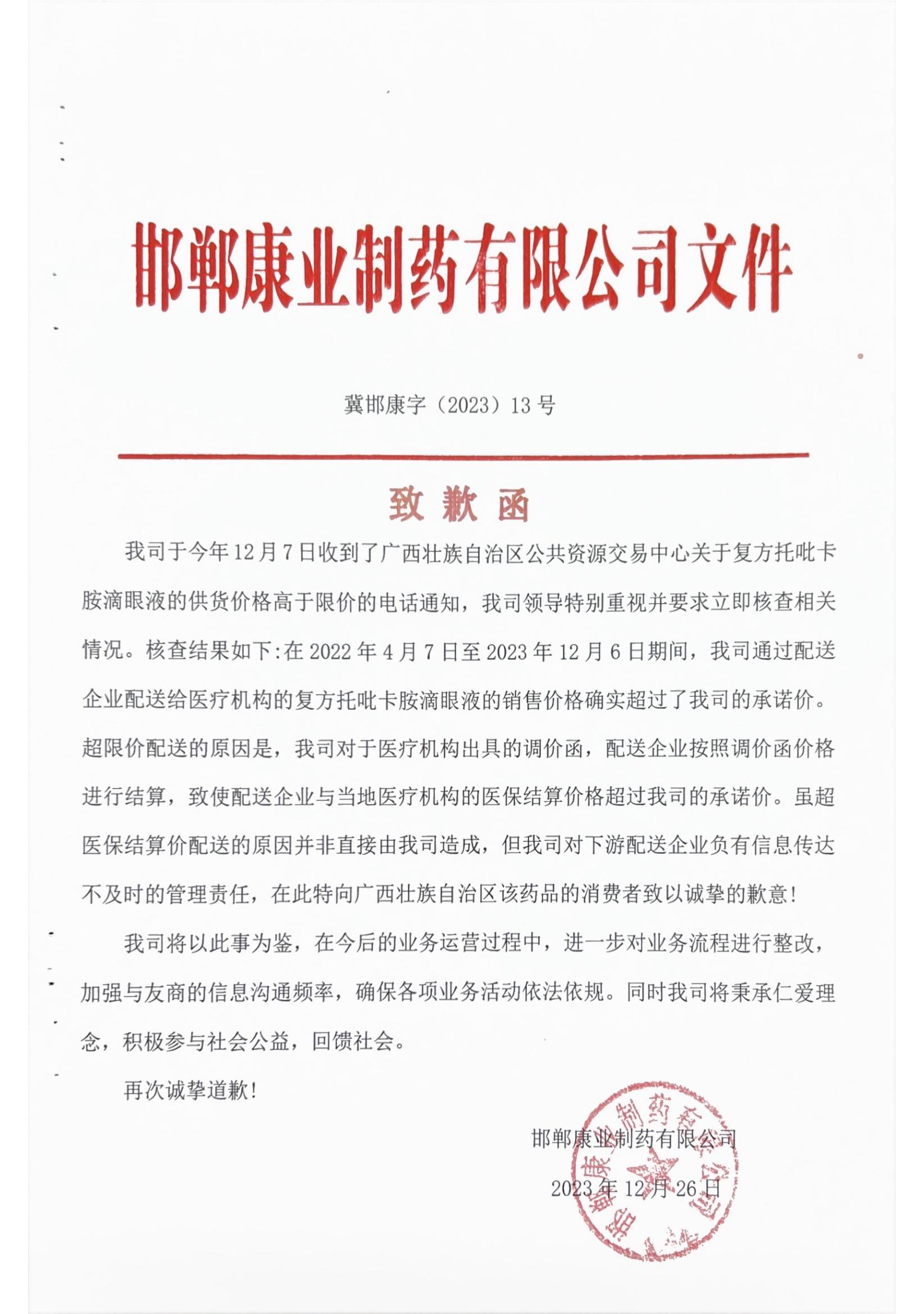【广西】广西壮族自治区公共资源交易中心发布邯郸康业制药有限公司致歉函