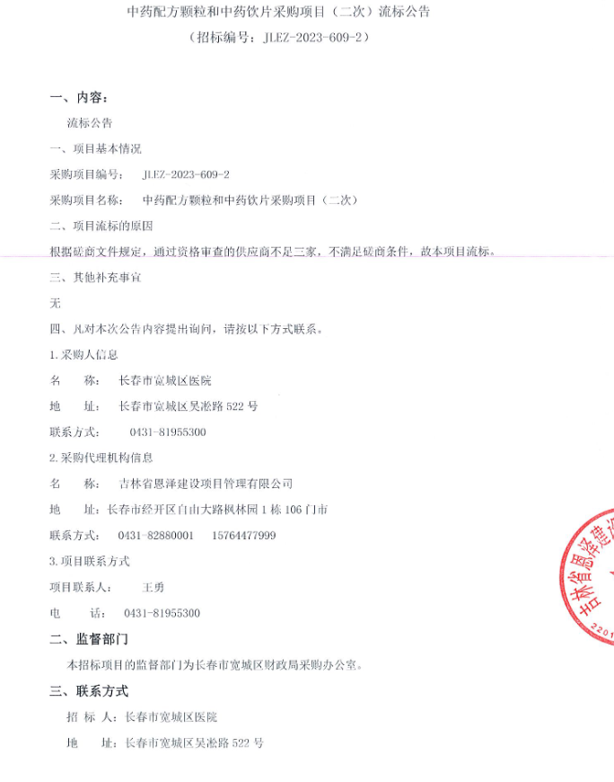 【长春市宽城区医院】吉林省长春市宽城区中药配方颗粒和中药饮片采购项目(二次)流标公告