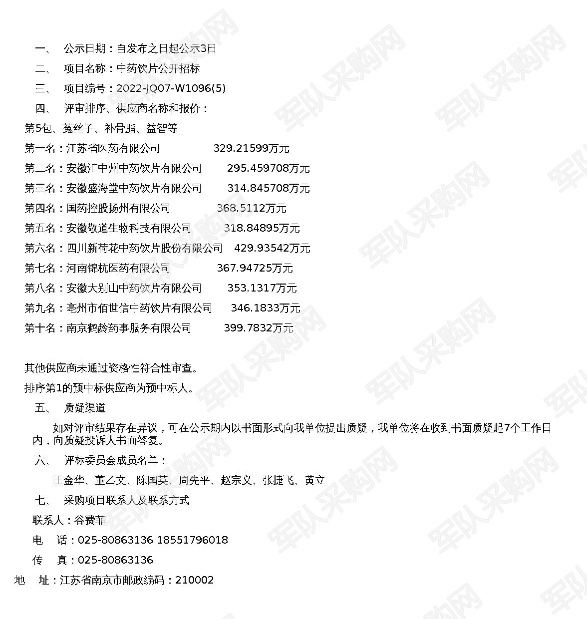 【军队采购网】中药饮片公开招标结果公示(2022-JQ07-W1096(5))
