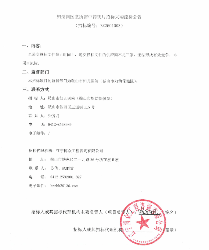 【鞍山市妇儿医院】辽宁省鞍山市妇孺国医堂所需中药饮片招标采购流标公告