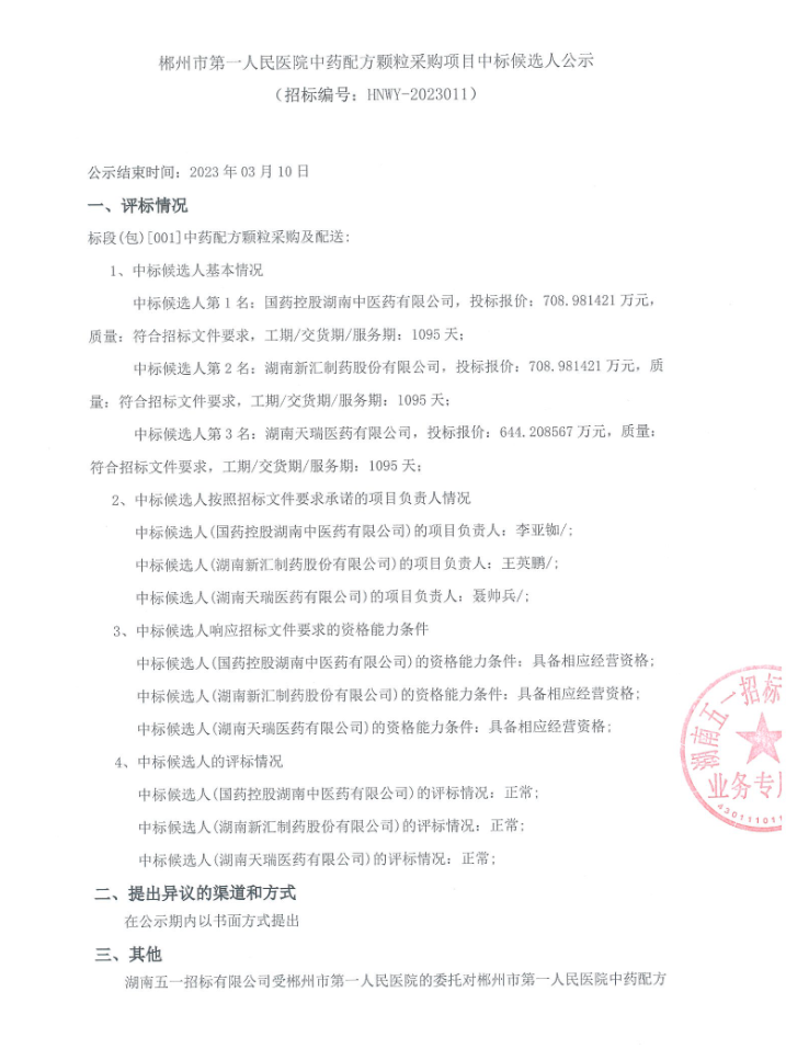 【郴州市第一人民医院】湖南省郴州市第一人民医院中药配方颗粒采购项目中标候选人公示