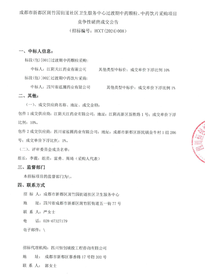 【成都市新都区斑竹园街道社区卫生服务中心】四川省成都市新都区斑竹园街道社区卫生服务中心过渡期中药颗粒、中药饮片采购项目竞争性磋商成交公告
