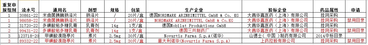 经核查,申请禁用的目录均为普通挂网属性,由药品代理商重复申报造成。为规范药品集中采购,同意禁用相关重复申报的挂网药品目录,特此公示!