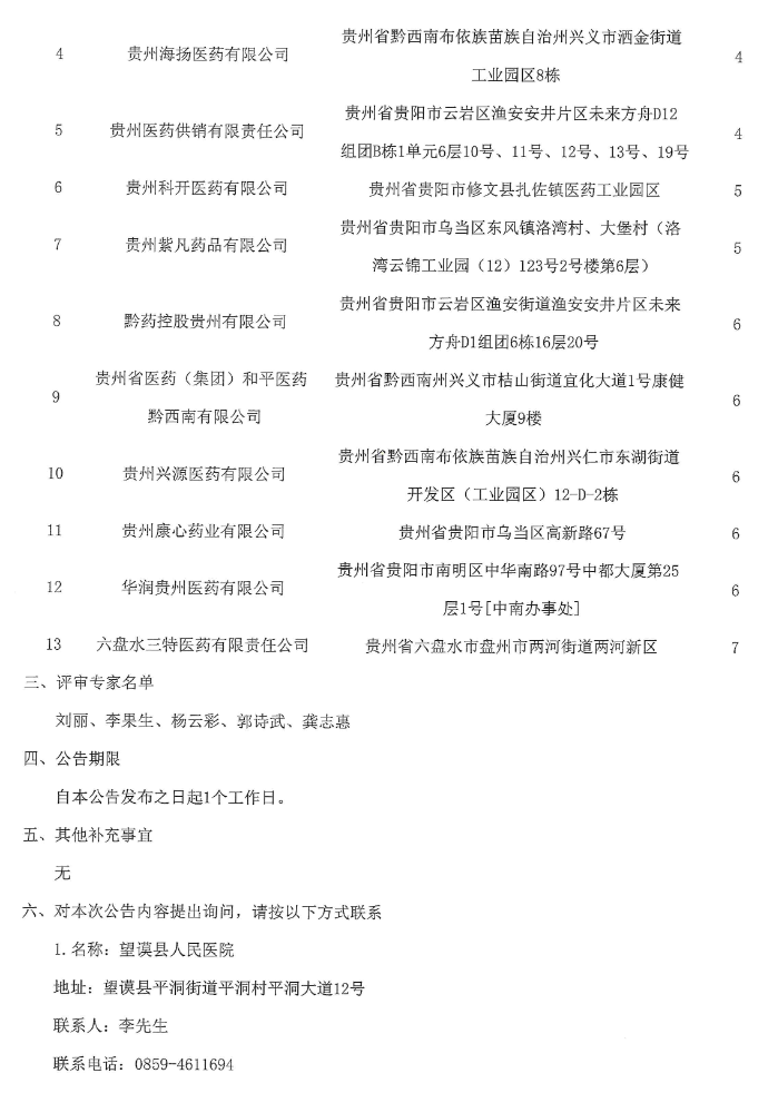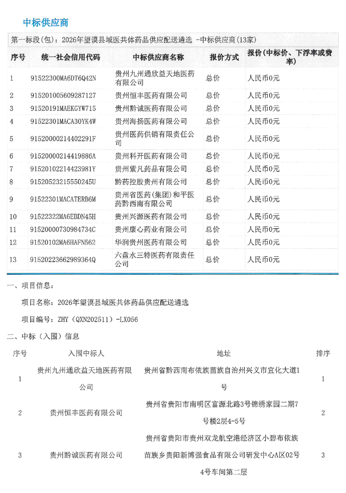 【黔西南布依苗族自治州望谟县人民医院】贵州省2026年望谟县域医共体药品供应配送遴选入围结果公告