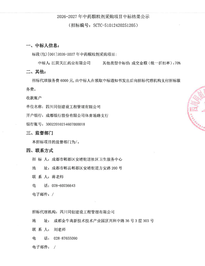 【成都市郫都区安靖街道社区卫生服务中心】四川省成都市郫都区安靖街道社区卫生服务中心2026-2027年中药颗粒剂采购项目中标结果公示
