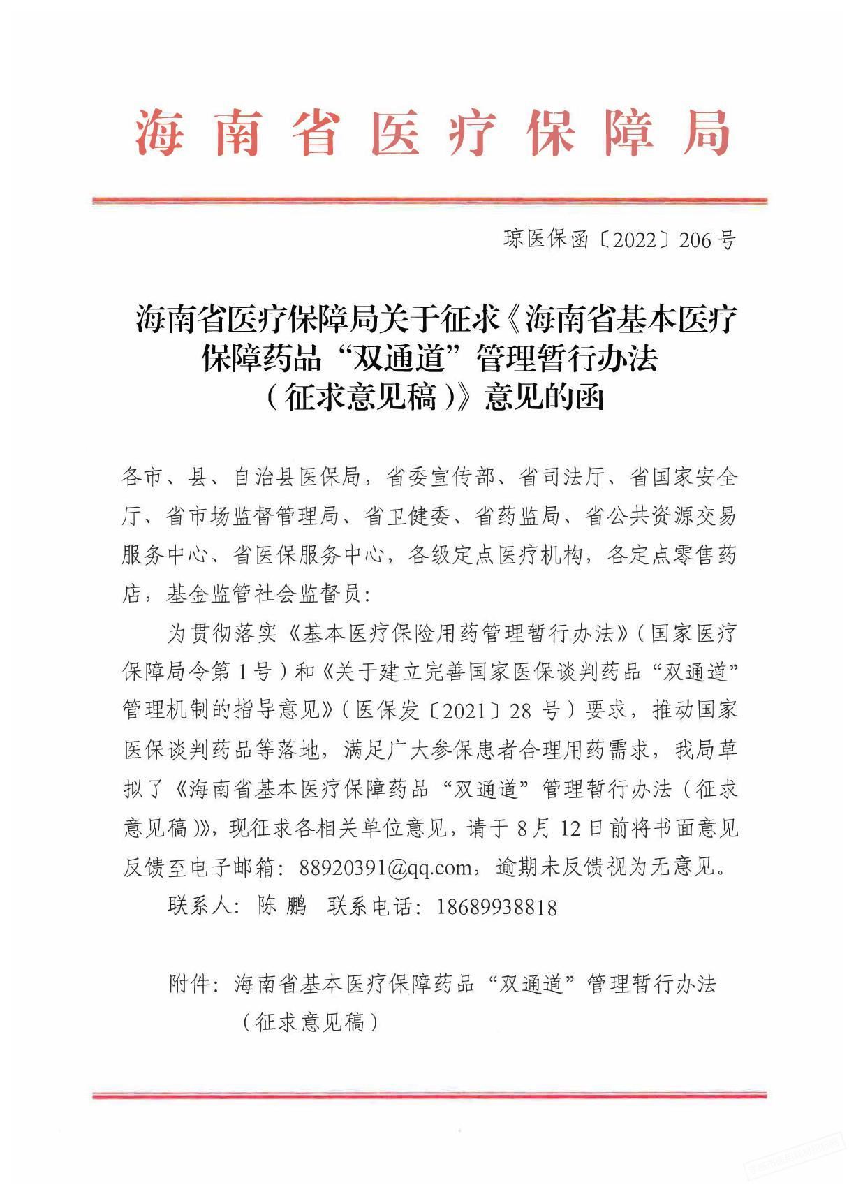 【海南】海南省医疗保障局关于征求《海南省基本医疗保障药品“双通道”管理暂行办法(征求意见稿)》意见的函