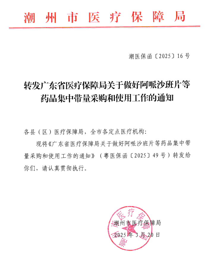 【潮州】潮医保函〔2025〕16号 转发广东省医疗保障局关于做好阿哌沙班片等药品集中带量采购和使用工作的通知