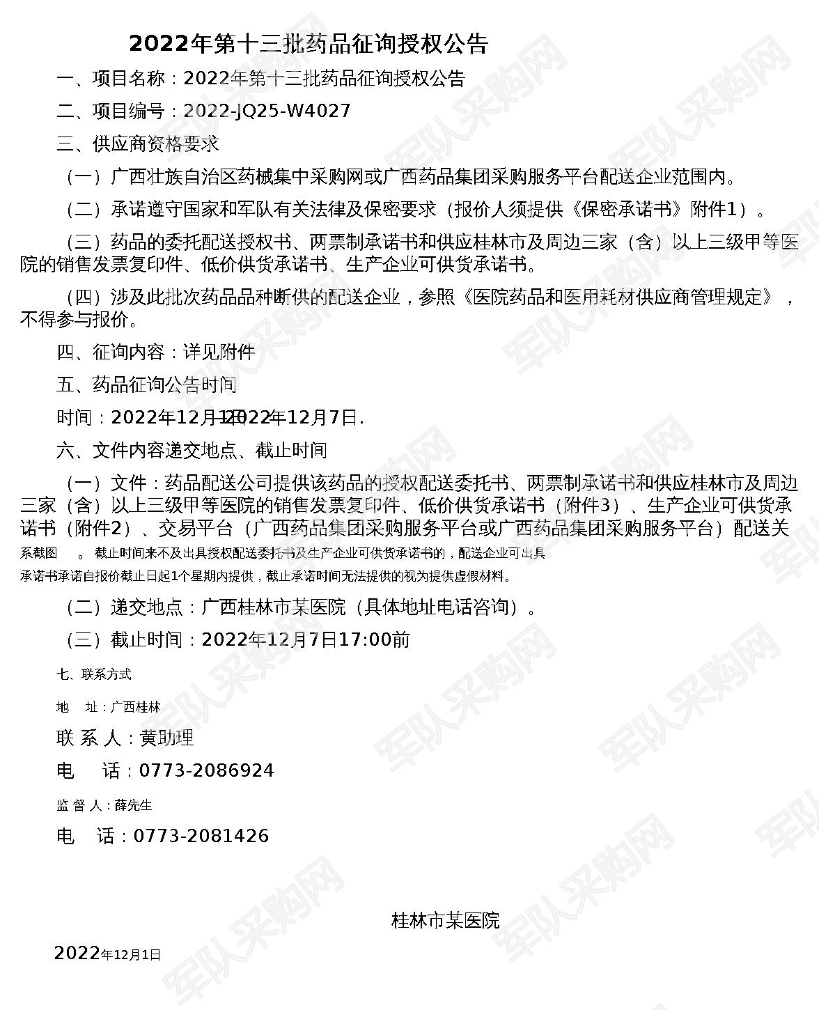 【桂林市某医院】军队采购网2022年第十三批药品征询授权公告(2022-JQ25-W4027)