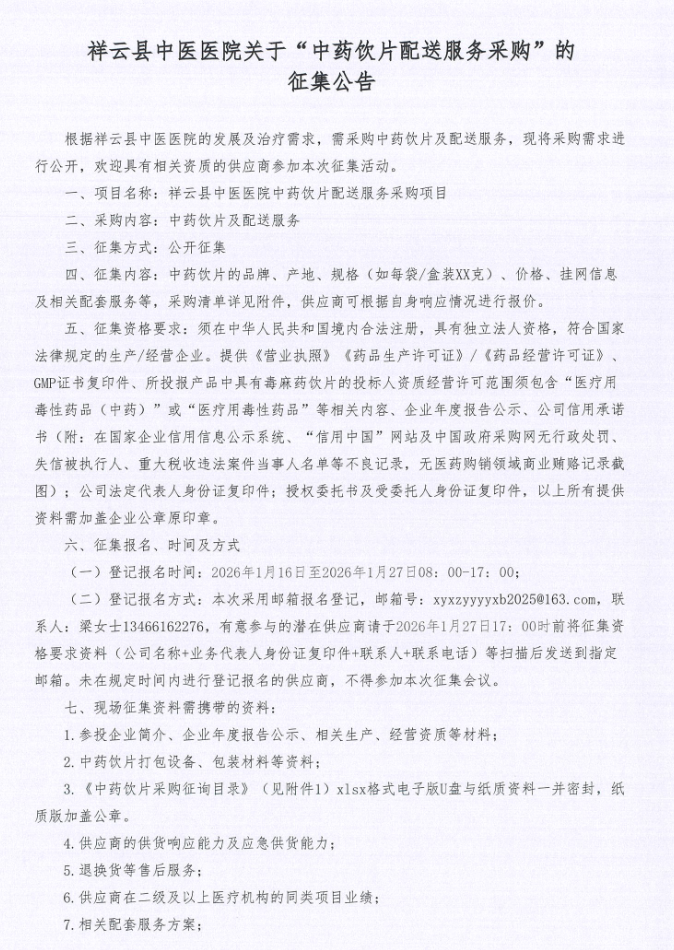 【大理白族自治州祥云县中医医院】云南省大理白族自治州祥云县中医医院关于“中药饮片配送服务采购”的征集公告