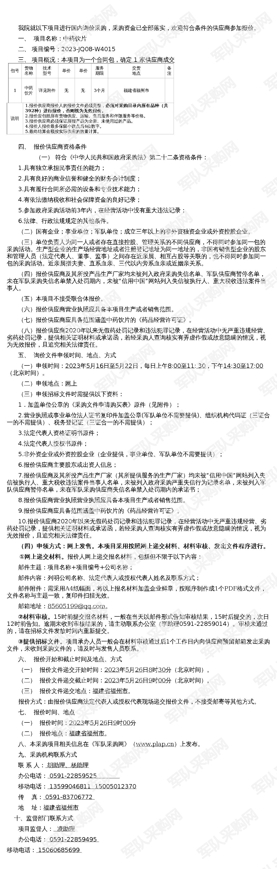 【军队采购】军队采购网中药饮片询价公告(2023-JQ08-W4015)