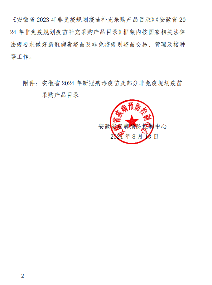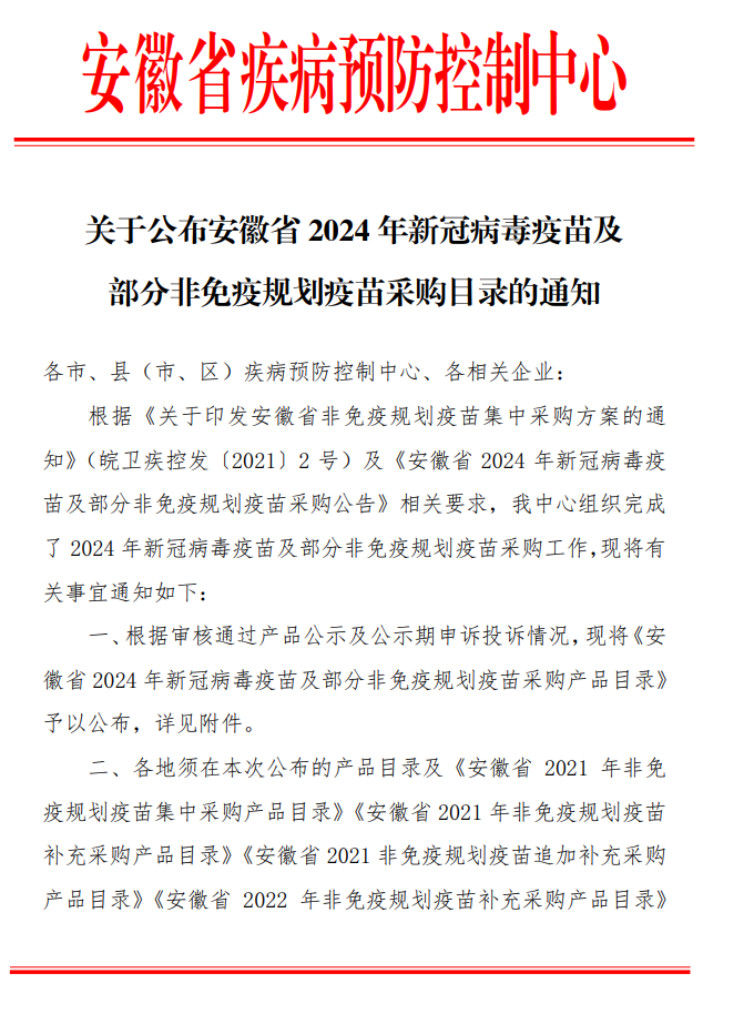 【安徽】转关于公布安徽省2024年新冠病毒疫苗及部分非免疫规划疫苗采购目录的通知