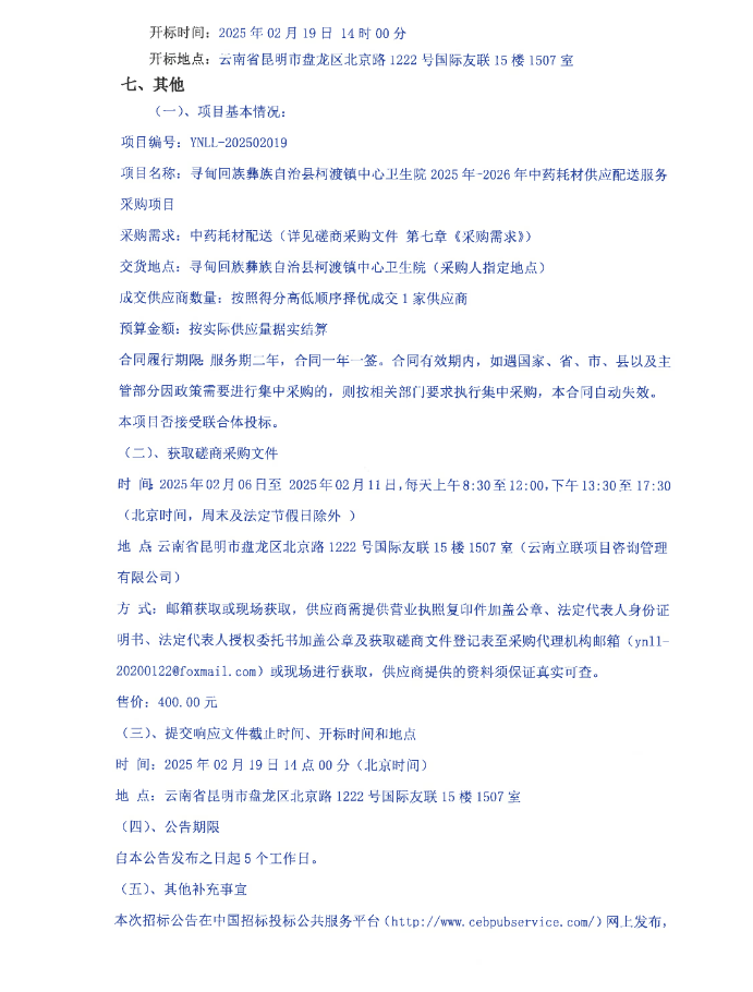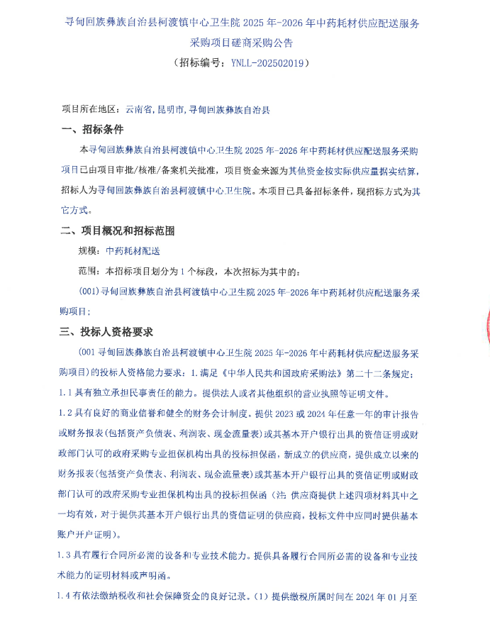 【昆明市寻甸回族彝族自治县柯渡镇中心卫生院】云南省昆明市寻甸回族彝族自治县柯渡镇中心卫生院2025年-2026年中药耗材供应配送服务采购项目磋商采购公告