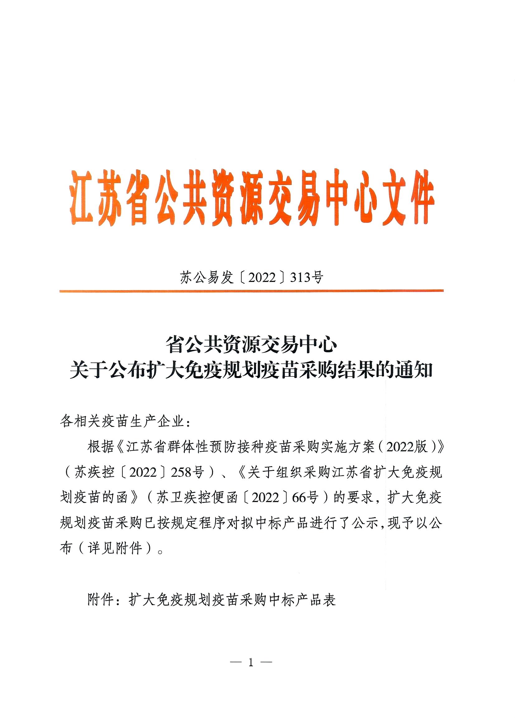 【江苏】江苏省公共资源交易中心关于公布扩大免疫规划疫苗采购结果的通知