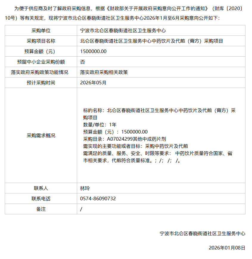 【宁波市北仑区春晓街道社区卫生服务中心】浙江省宁波市北仑区春晓街道社区卫生服务中心2026年1月至6月政府采购意向1