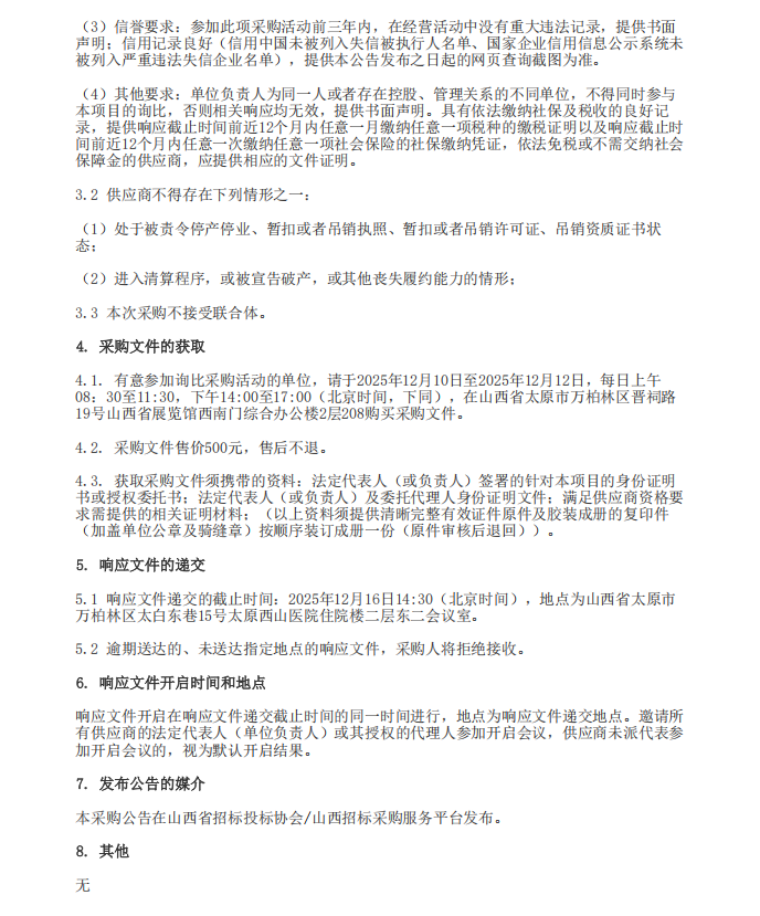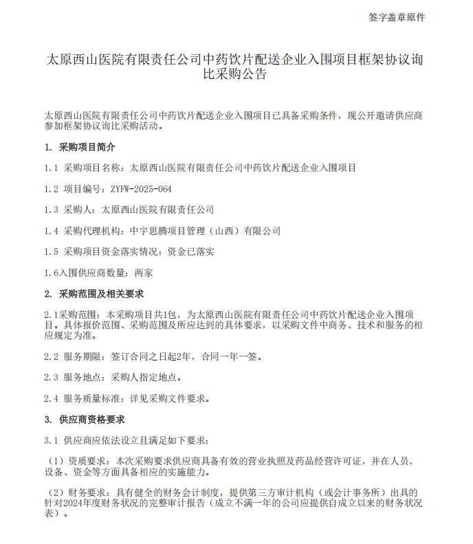 【太原西山医院】山西省太原西山医院有限责任公司中药饮片配送企业入围项目框架协议询比采购公告