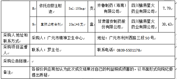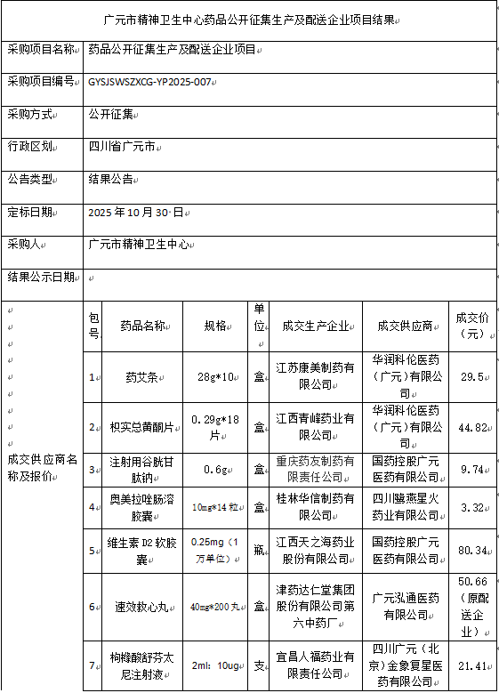 【广元市精神卫生中心】四川省广元市精神卫生中心药品公开征集生产及配送企业项目结果