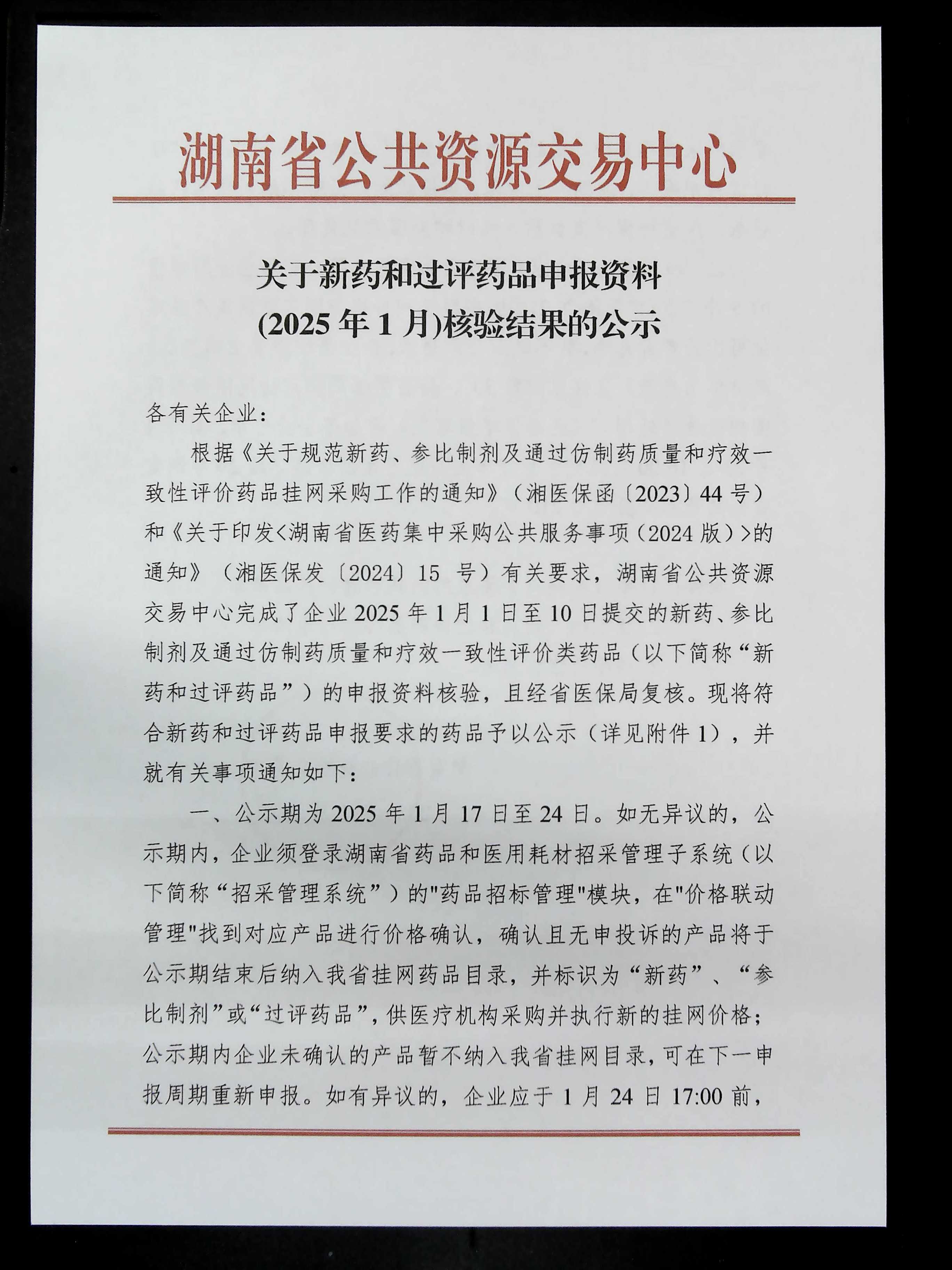 根据《关于规范新药、参比制剂及通过仿制药质量和疗效一致性评价药品挂网采购工作的通知》(湘医保函〔2023〕44号)和《关于印发<湖南省医药集中采购公共服务事项(2024版)>的通知》(湘医保发〔2024〕15号)有关要求,湖南省公共资源交易中心完成了企业2025年1月1日至10日提交的新药、参比制剂及通过仿制药质量和疗效一致性评价类药品(以下简称“新药和过评药品")的申报资料核验,且经省医保局复核。现将符合新药和过评药品申报要求的药品予以公示(详见附件1),并就有关事项通知如下: