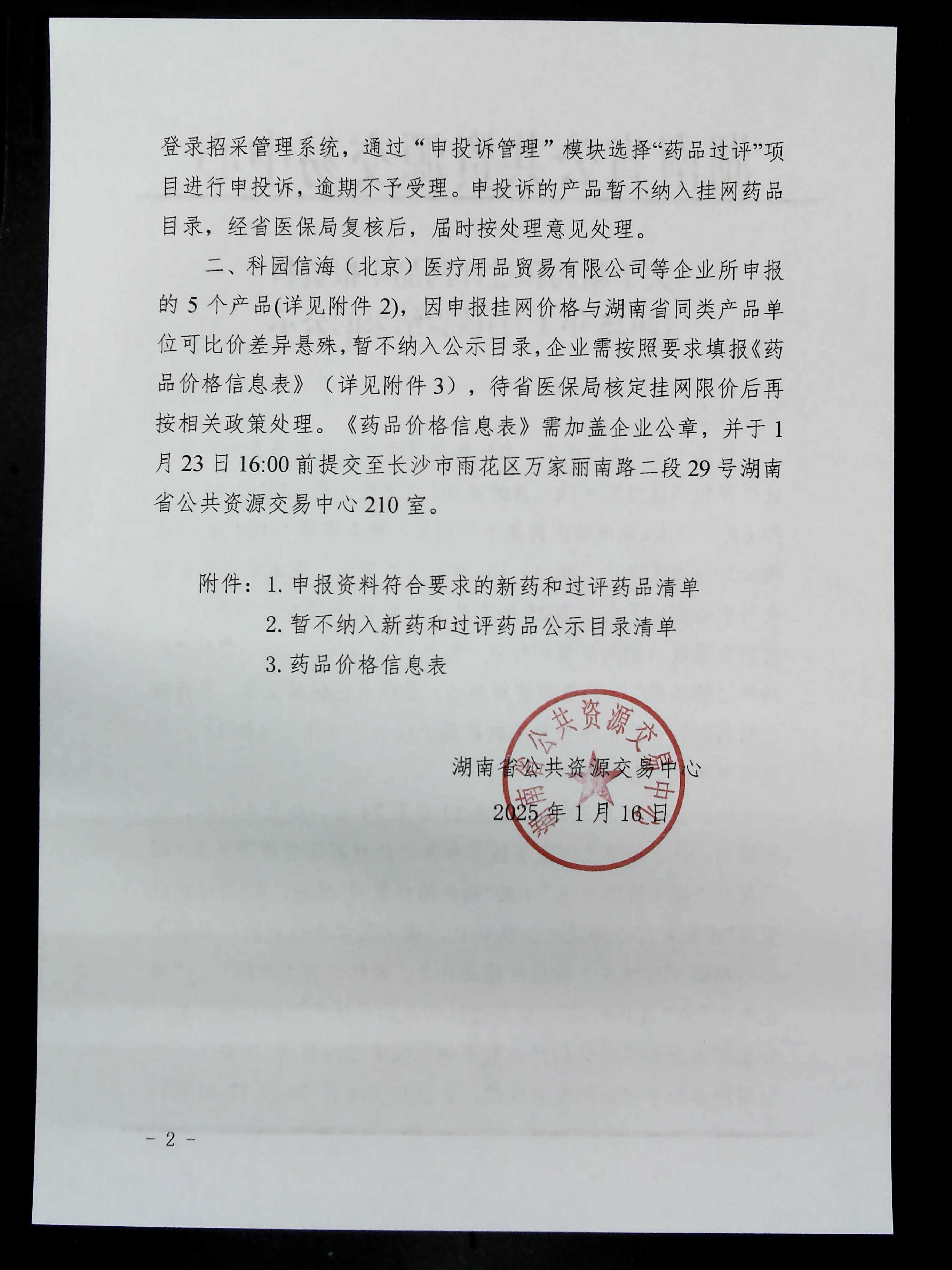 二、科园信海(北京)医疗用品贸易有限公司等企业所申报的5个产品(详见附件2),因申报挂网价格与湖南省同类产品单位可比价差异悬殊,暂不纳入公示目录,企业需按照要求填报《药品价格信息表》(详见附件3),待省医保局核定挂网限价后再按相关政策处理。《药品价格信息表》需加盖企业公章,并于1月23日16:00前提交至长沙市雨花区万家丽南路二段29号湖南省公共资源交易中心210室。