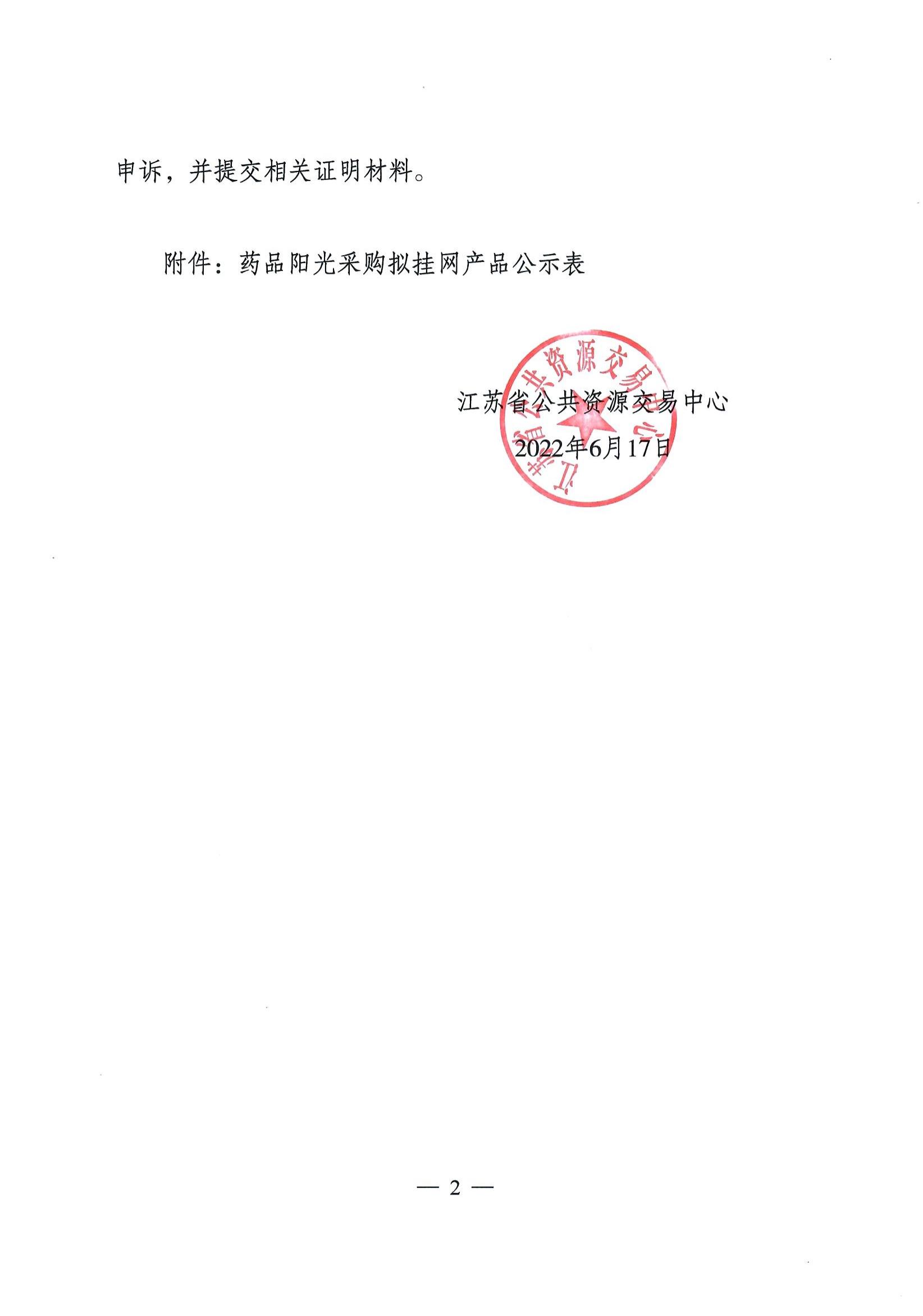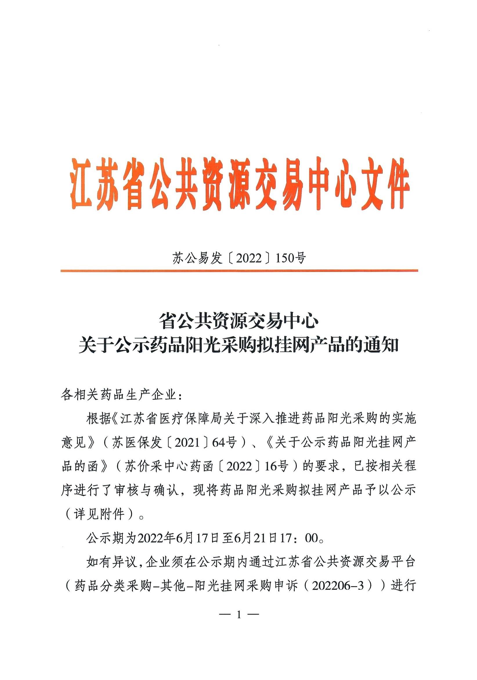 【江苏】省公共资源交易中心关于公示药品阳光采购拟挂网产品的通知(20220617)