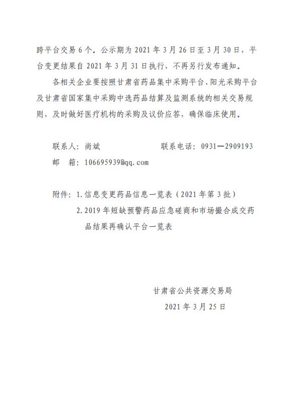 【甘肃】2021年甘肃省关于公布部分药品信息变更和平台调整等事宜的通知(2021年第三批) 甘交易医字〔2021〕41 号