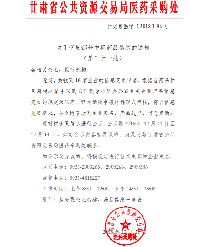 【甘肃】甘肃省关于变更部分中标药品信息的通知(第三十一批)甘交易医字〔2018〕96号
