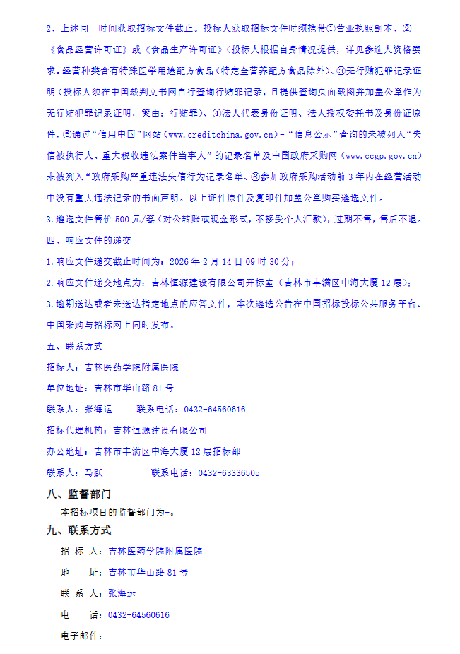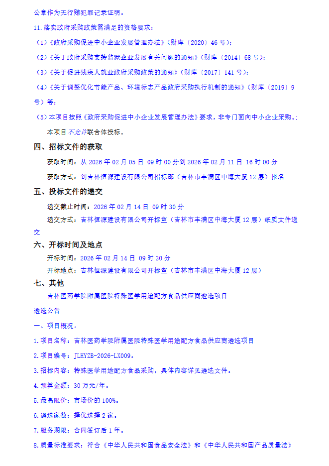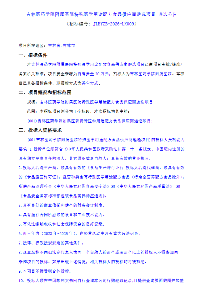 【吉林医药学院】吉林医药学院附属医院特殊医学用途配方食品供应商遴选项目遴选公告