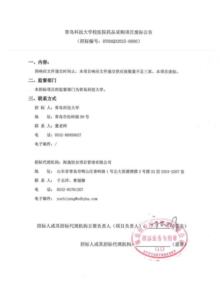 【青岛科技大学校医院】山东省青岛科技大学校医院药品采购项目废标公告