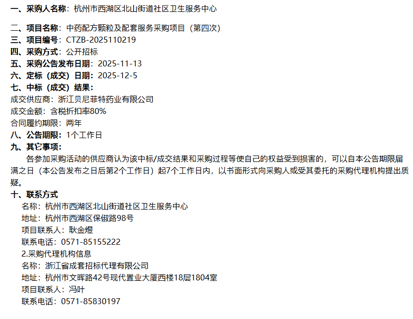 【杭州市西湖区北山街道社区卫生服务中心】浙江省成套招标代理有限公司关于杭州市西湖区北山街道社区卫生服务中心中药配方颗粒及配套服务采购项目(第四次)的中标(成交)结果公告