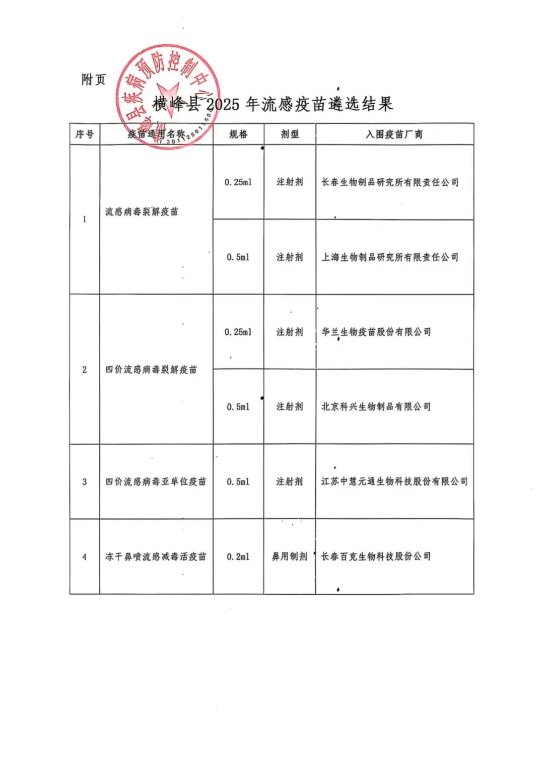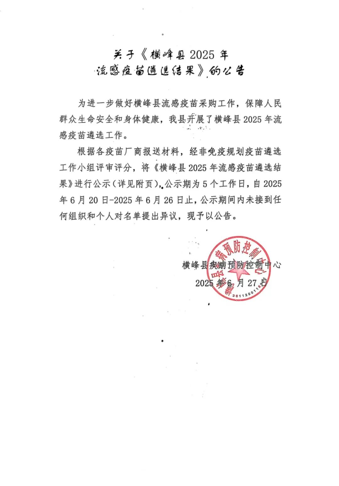 【上饶】横峰县2025年流感疫苗遴选结果公告