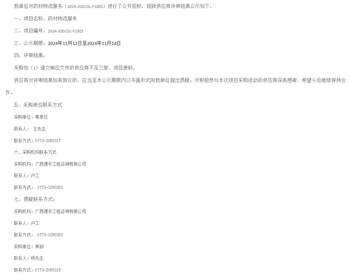 【军队采购】军队采购网药材物流服务废标公告(2024-JQGCGL-F1003)