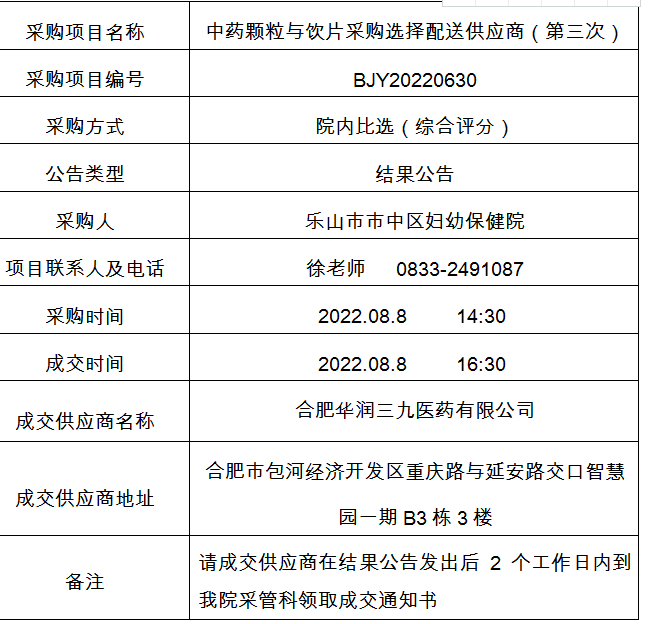 【乐山市市中区妇幼保健院】关于中药颗粒与饮片采购选择配送供应商(第三次)采购结果公告