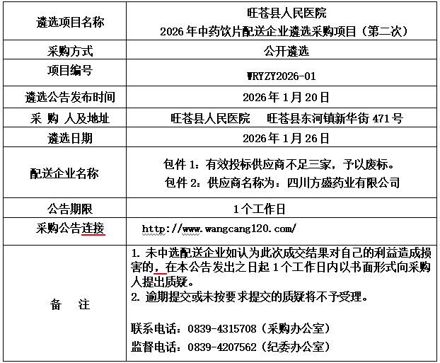 【广元市旺苍县人民医院】四川省广元市旺苍县人民医院2026年中药饮片配送企业遴选采购项目(第二次)遴选结果公告