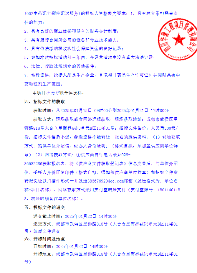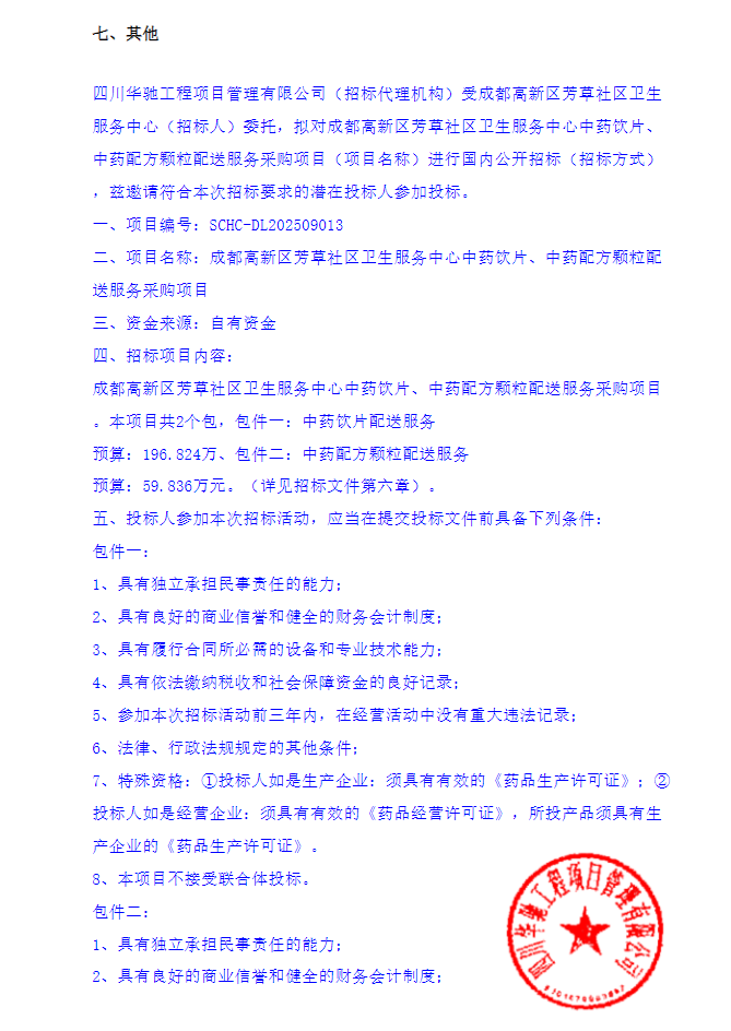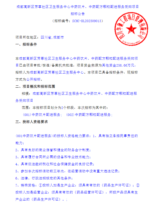 【成都高新区芳草社区卫生服务中心】四川省成都高新区芳草社区卫生服务中心中药饮片、中药配方颗粒配送服务采购项目招标公告