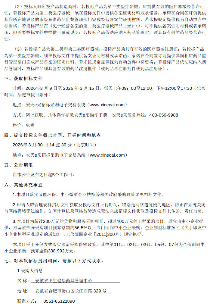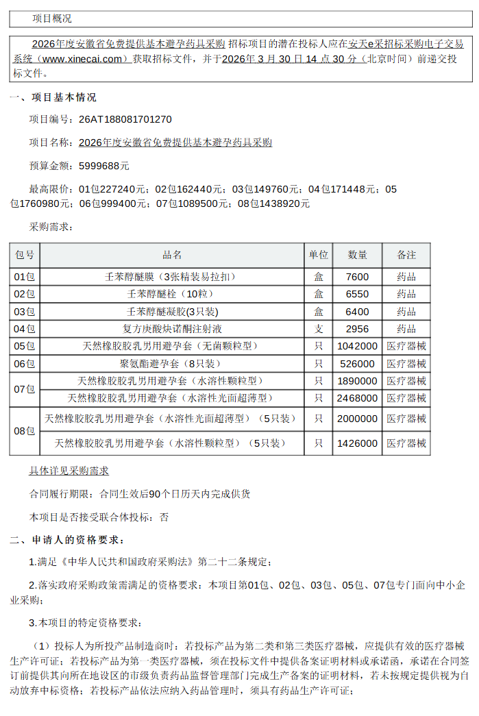 【安徽省卫生健康药具管理中心】2026年度安徽省免费提供基本避孕药具采购采购公告