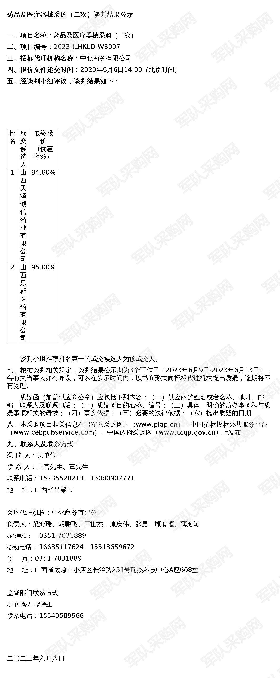 【军队采购】军队采购网药品及医疗器械采购(二次)谈判成交公告(2023-JLHKLD-W3007)