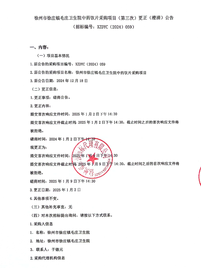 【徐州市徐庄镇毛庄卫生院】江苏省徐州市徐庄镇毛庄卫生院中药饮片采购项目(第三次)更正(澄清)公告