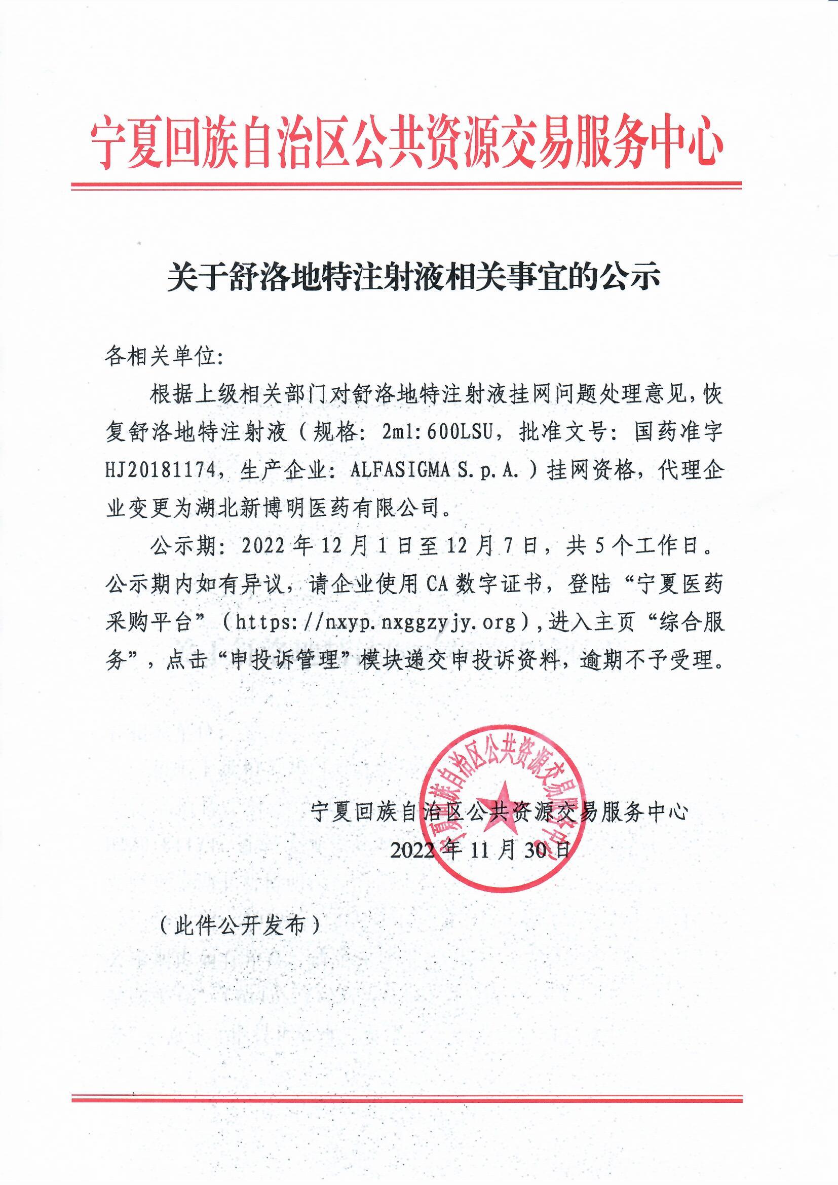 根据上级相关部门对舒洛地特注射液挂网问题处理意见,恢复舒洛地特注射液(规格∶2ml∶600LSU,批准文号∶国药准字HJ20181174,生产企业∶ALFASIGMAS.p.A.)挂网资格,代理企业变更为湖北新博明医药有限公司。