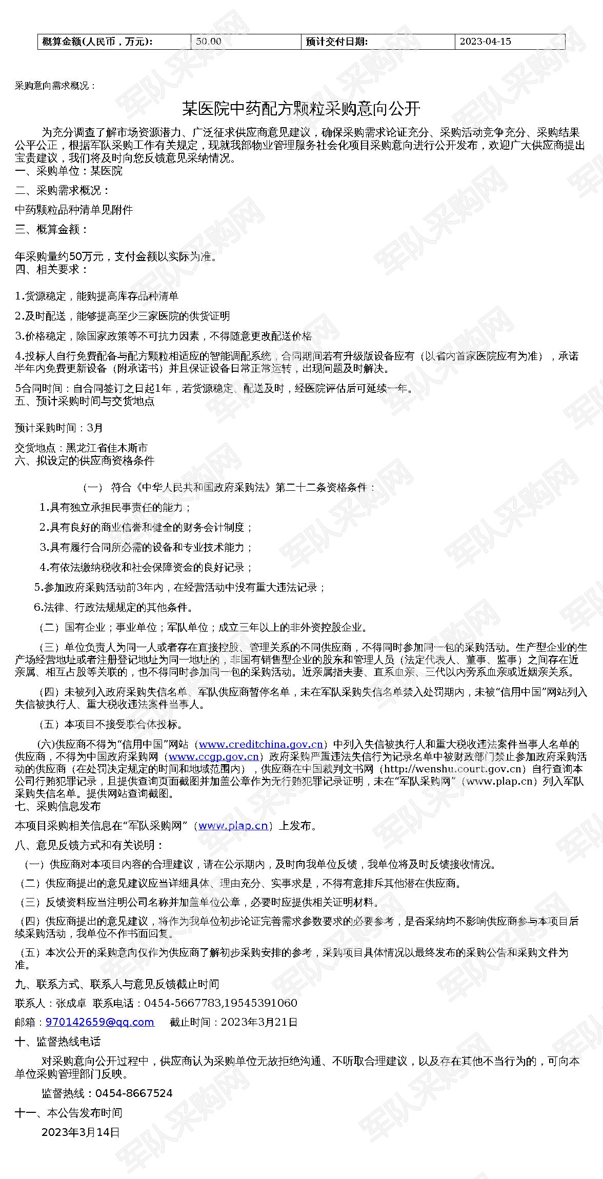 【军队采购】军队采购网某医院中药配方颗粒采购意向公开