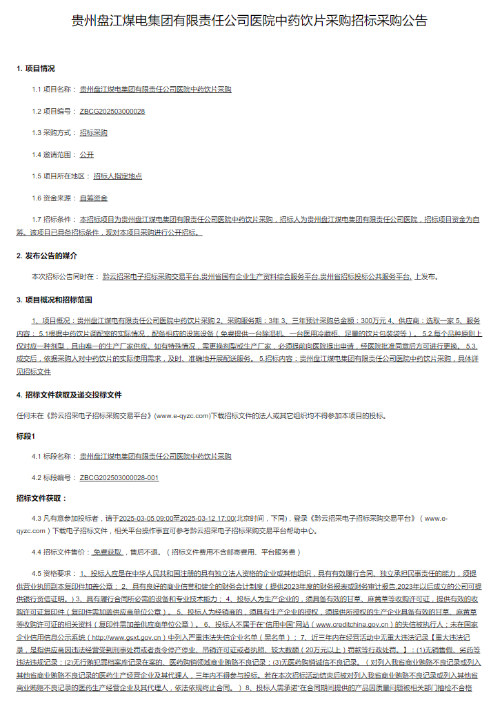 【盘江煤电集团有限责任公司医院】贵州盘江煤电集团有限责任公司医院中药饮片采购招标采购公告