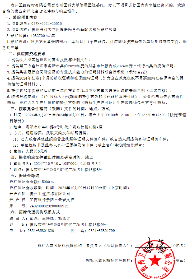 【贵州医科大学附属医院】贵州医科大学附属医院毒药品配送服务采购项目竞争性磋商公告