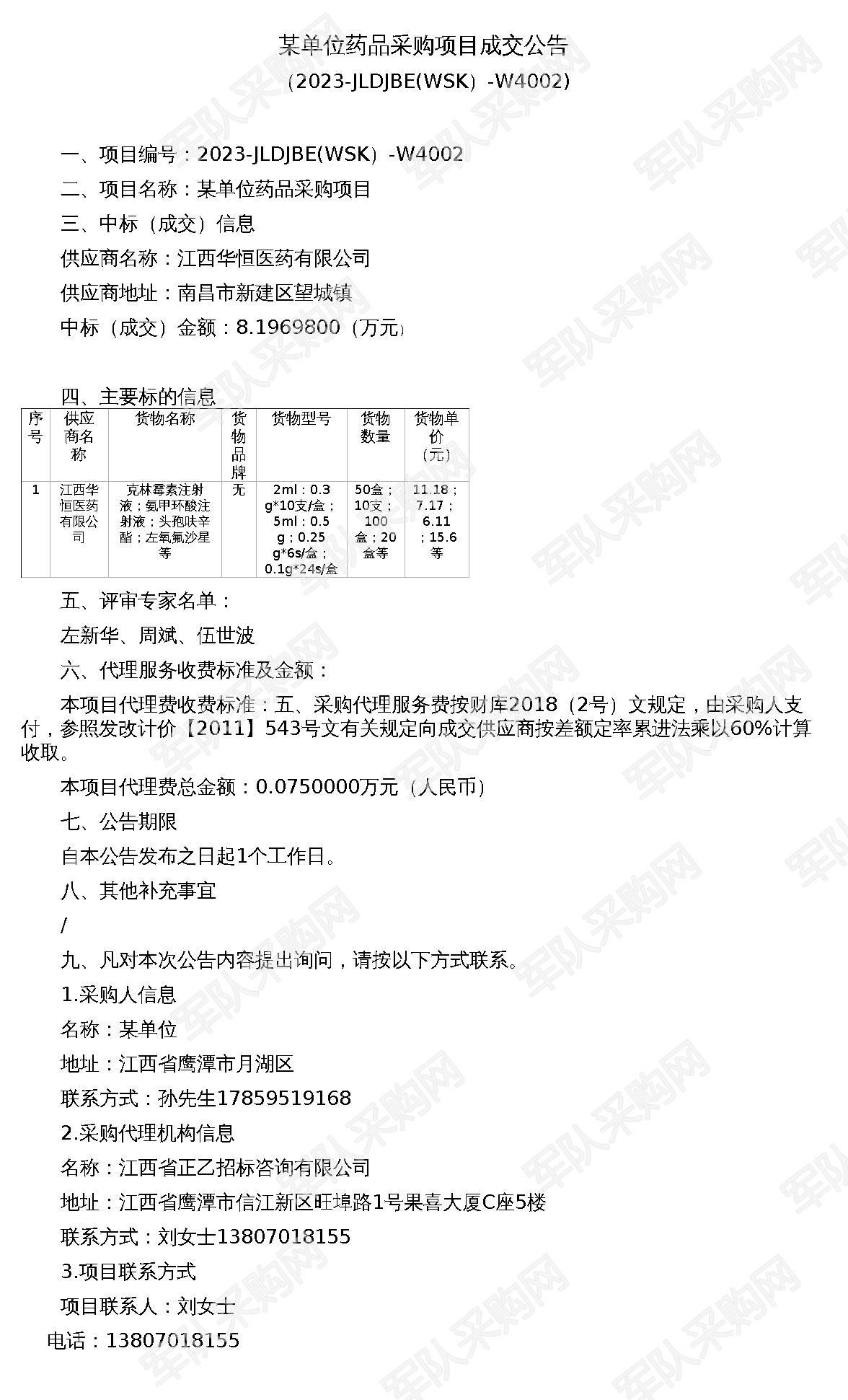 【军队采购】军队采购网某单位药品采购项目成交公告(2023-JLDJBE(WSK)-W4002)