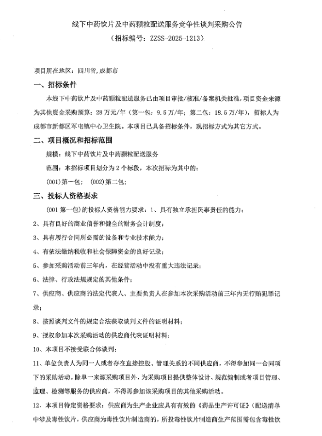 【成都市新都区军屯镇中心卫生院】四川省成都市新都区军屯镇中心卫生院线下中药饮片及中药颗粒配送服务竞争性谈判采购公告