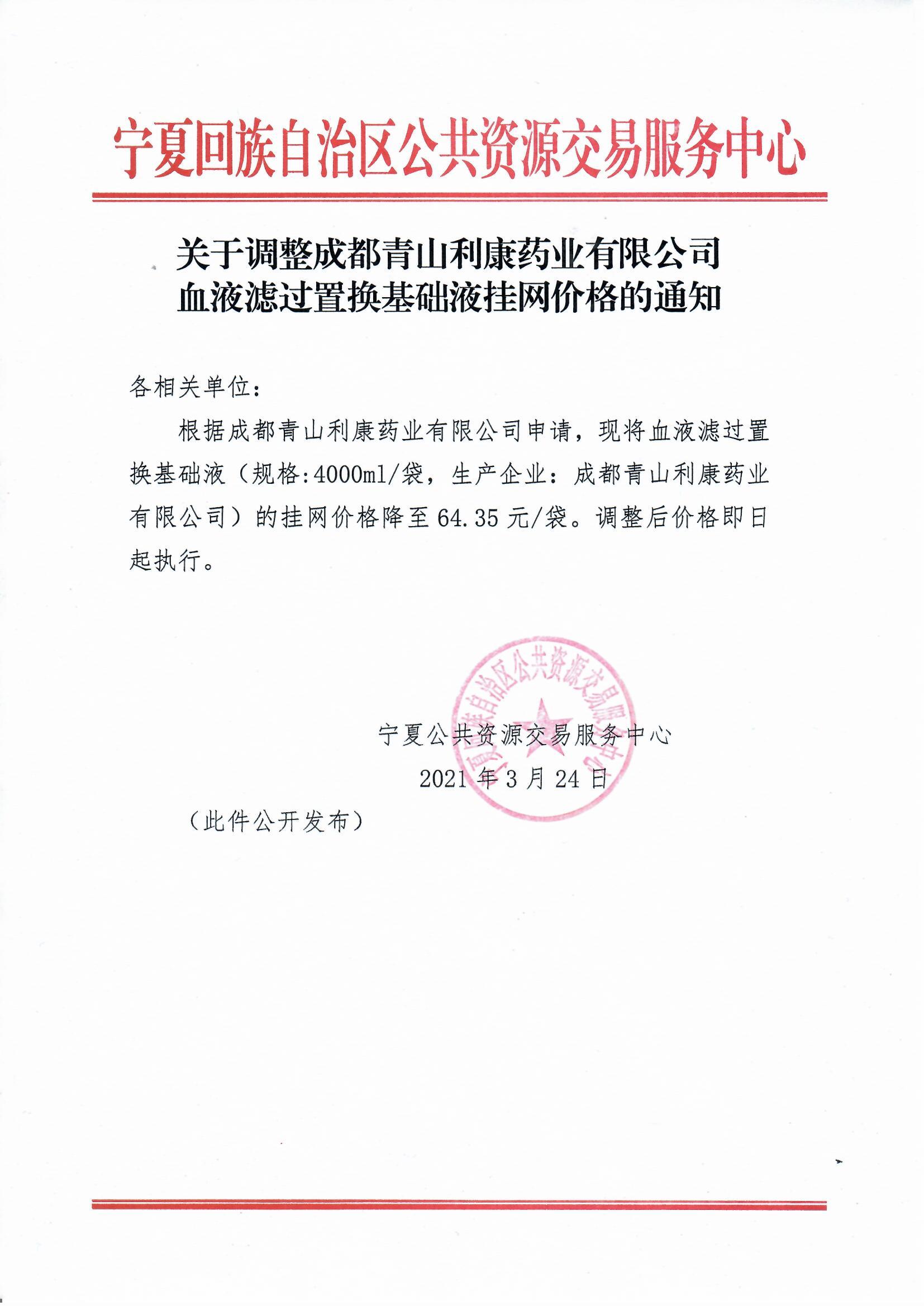 【宁夏】2021年宁夏自治区关于调整成都青山利康药业有限公司血液滤过置换基础液挂网价格的通知